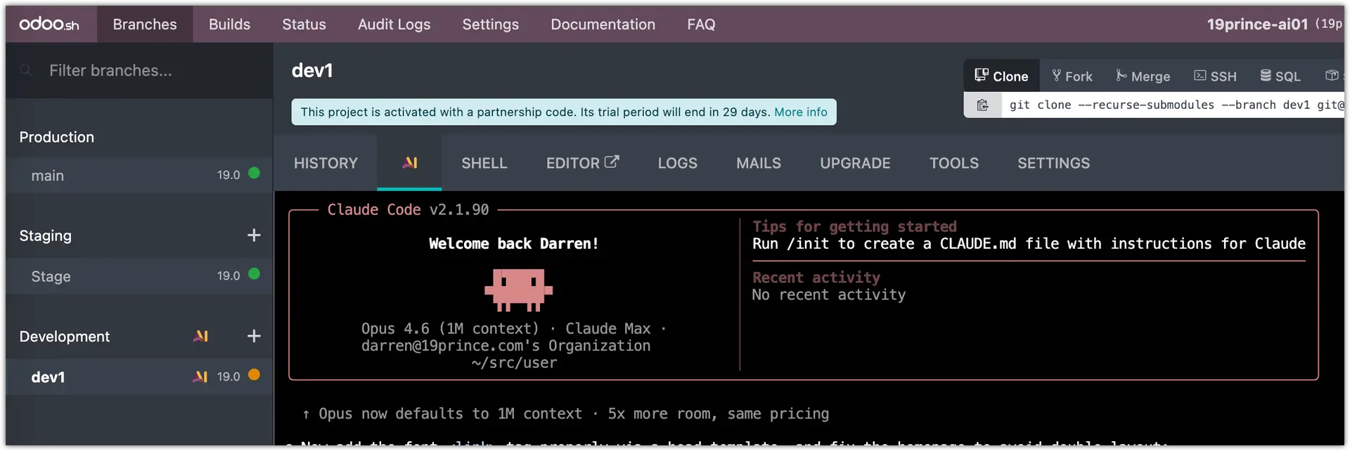 I wanted to believe this would work. The pitch is genuinely exciting: use Claude Code directly inside your Odoo.sh development environment, make changes, push to staging, and save the back-and-forth with a developer. I've used Claude Code in VS Code, I was ready for a better integration, better wiring, i.e. a real unlock.